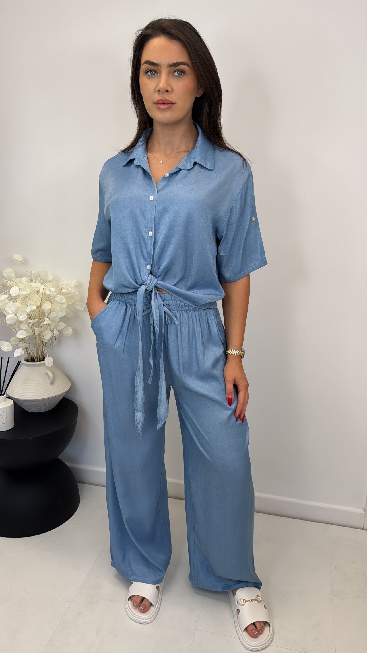 Effortlessly chic, this light blue blue denim co-ord combines a relaxed tie-shirt with tailored trousers for versatile spring and summer styling. The stretchy waistband ensures all-day comfort, while the denim-effect fabric delivers that coveted casual-cool aesthetic. Wear together for a coordinated look or mix and match with your existing wardrobe. A modern essential for warm-weather dressing.
