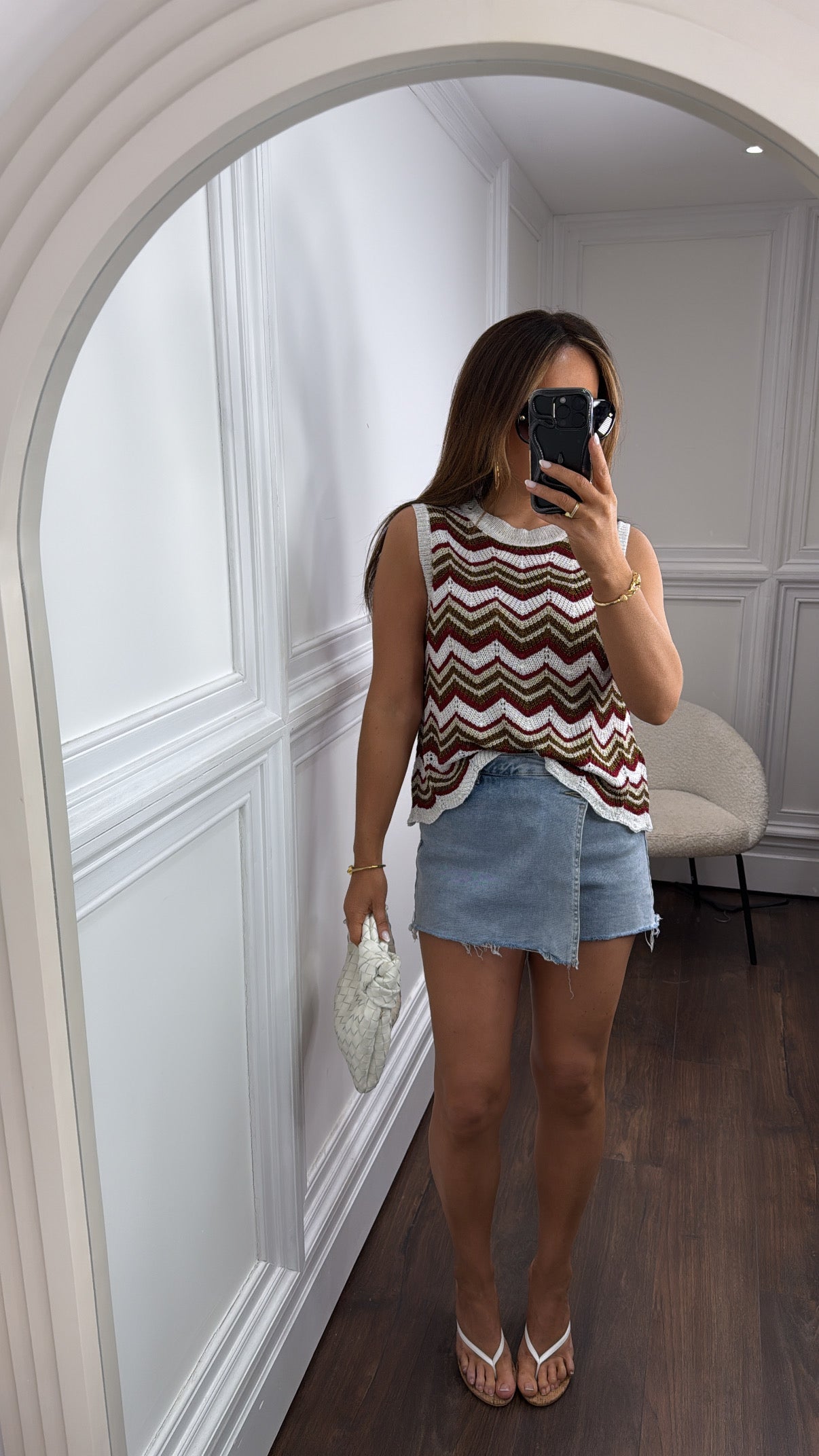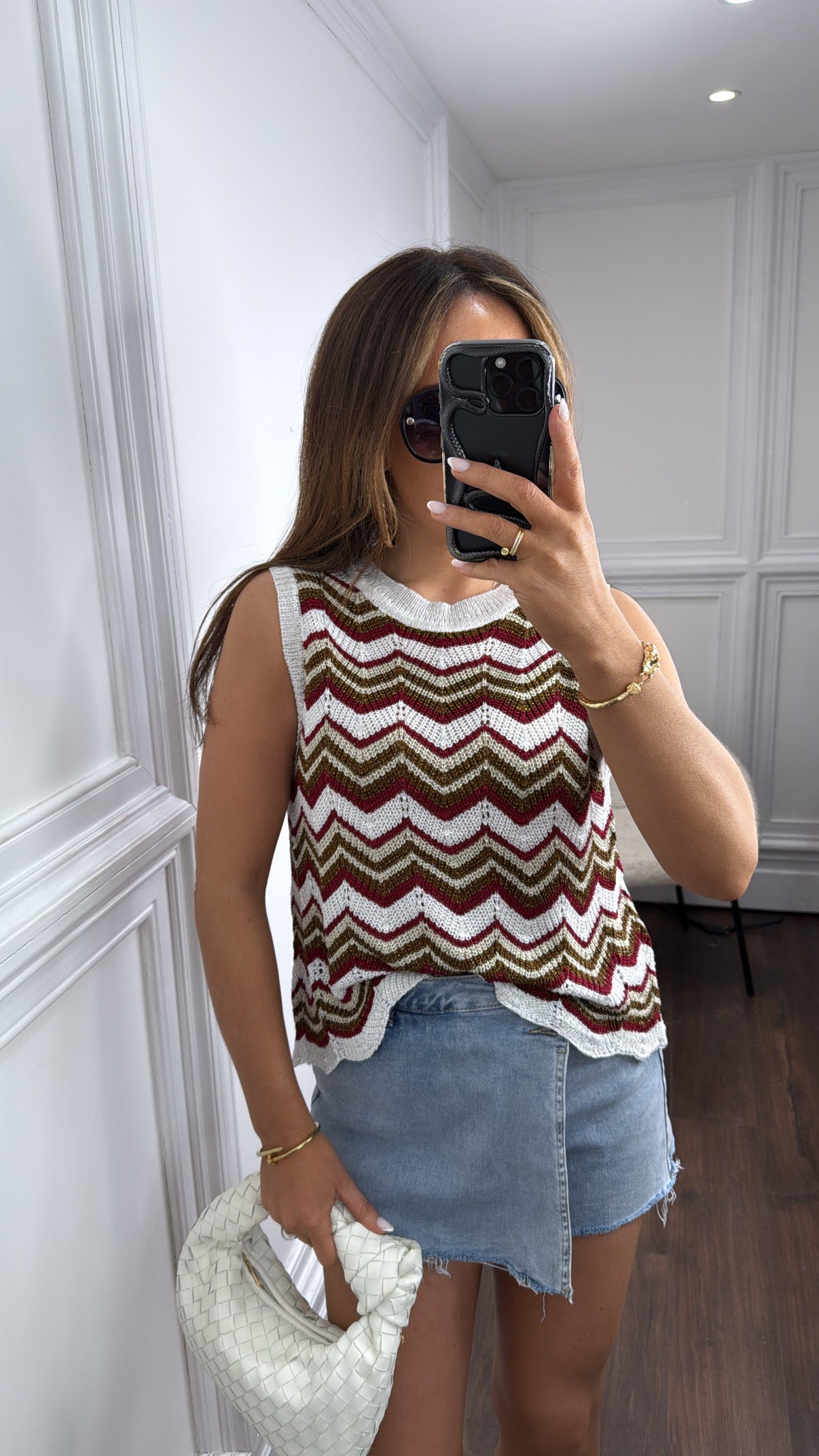 Made from a cozy, knitted material, the SAVANNAH whire and red zig zag vest is a stylish addition to any outfit. The unique zig zag design in shades of pink and brown adds a touch of personality, making it a versatile piece for any wardrobe. Keep warm and stylish with this must-have vest.