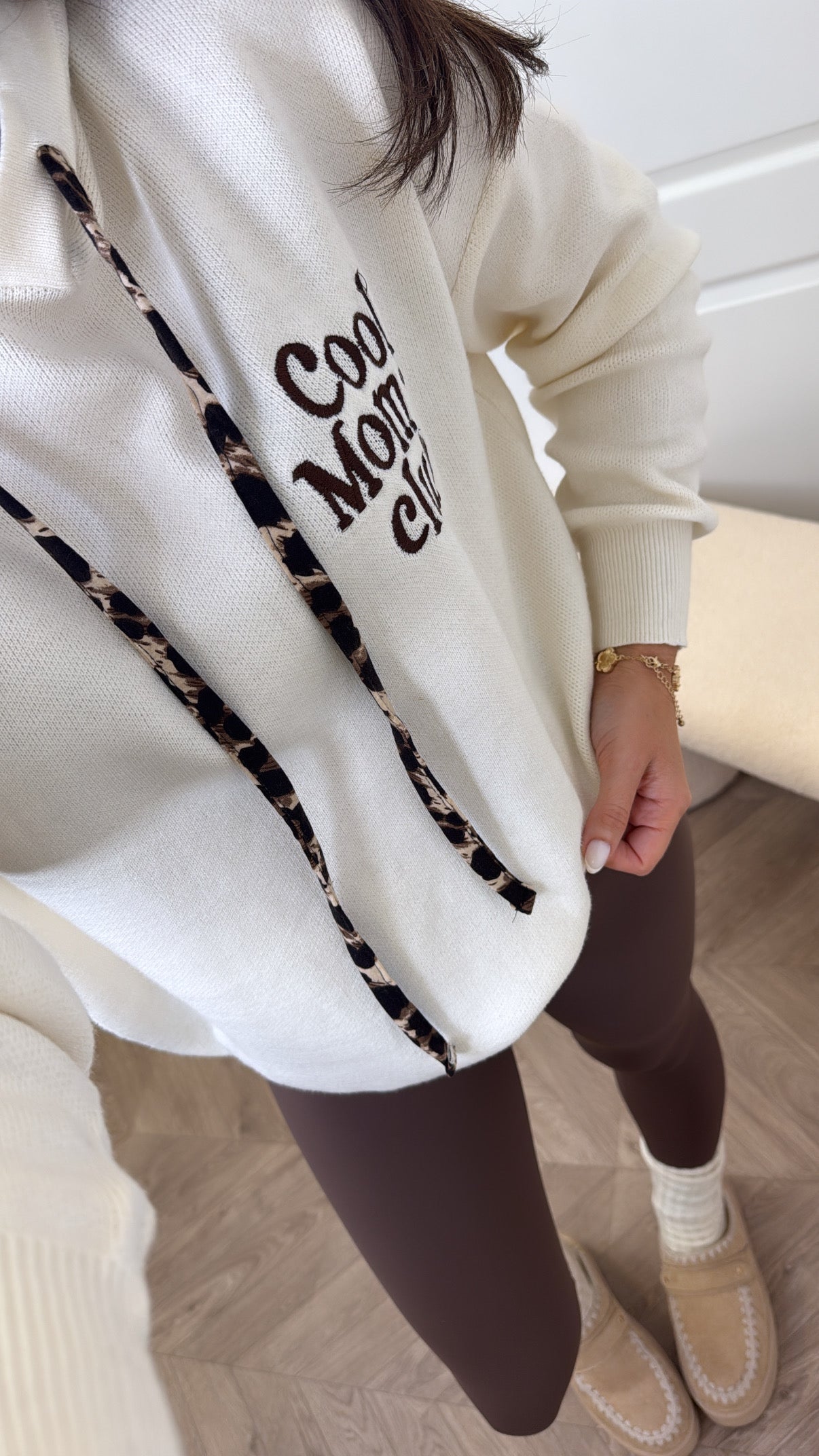 Elevate your casual wardrobe with the SCARLETT cream logo fine knit hoody. Crafted from soft, fine knit fabric, it offers a cosy feel perfect for everyday comfort. Featuring a stylish leopard print inside the hood and the bold "Cool Mom Club" logo, this hoody blends playful details with chic fashion, making it an essential piece for effortless, cool style.