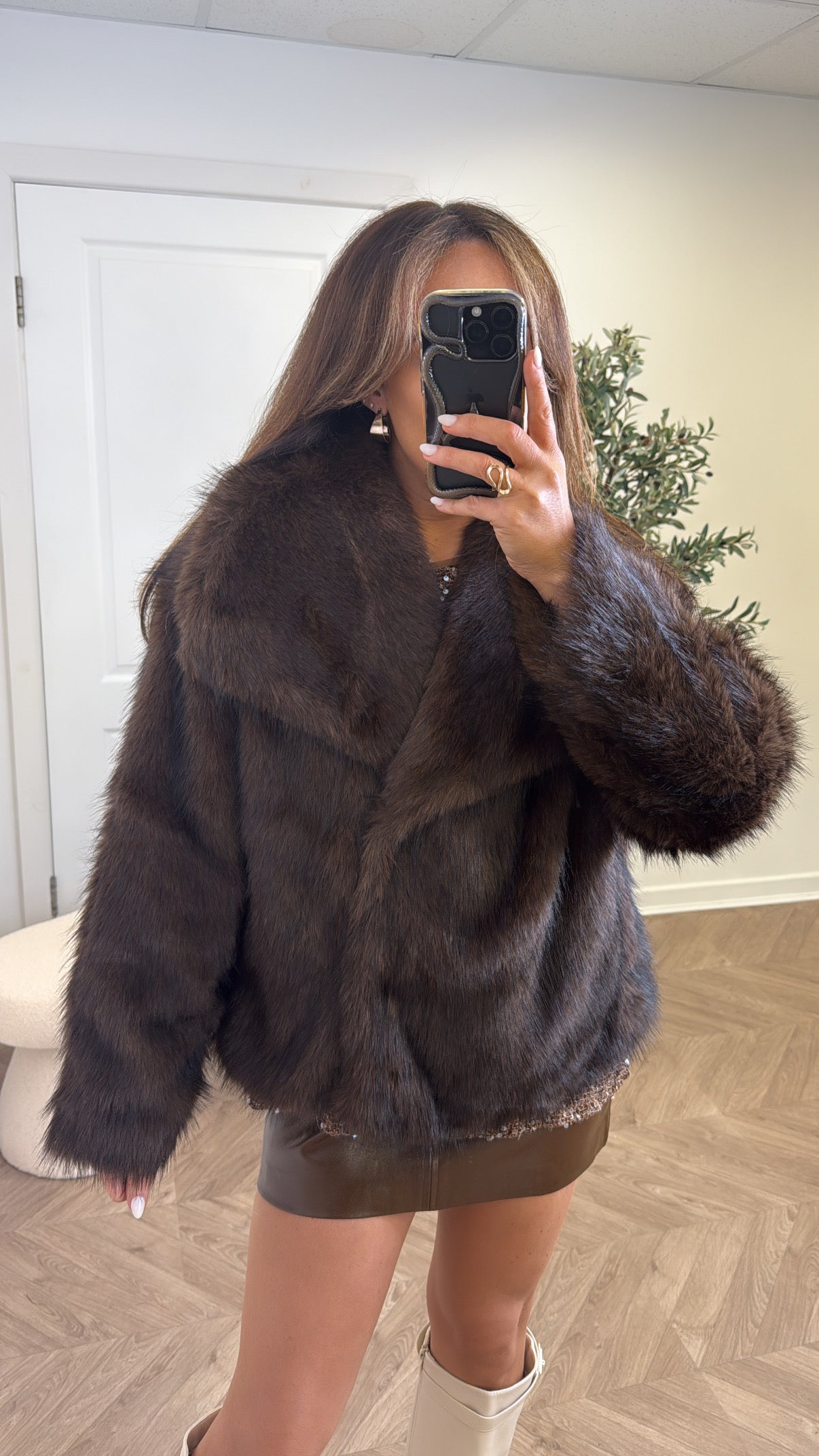 Elevate your style with the SERENA brown faux fur jacket, a glamorous and soft statement piece. This stunning jacket combines luxurious texture with rich color, perfect for adding warmth and sophistication to any outfit. Ideal for making an unforgettable impression, it blends comfort and high fashion effortlessly.