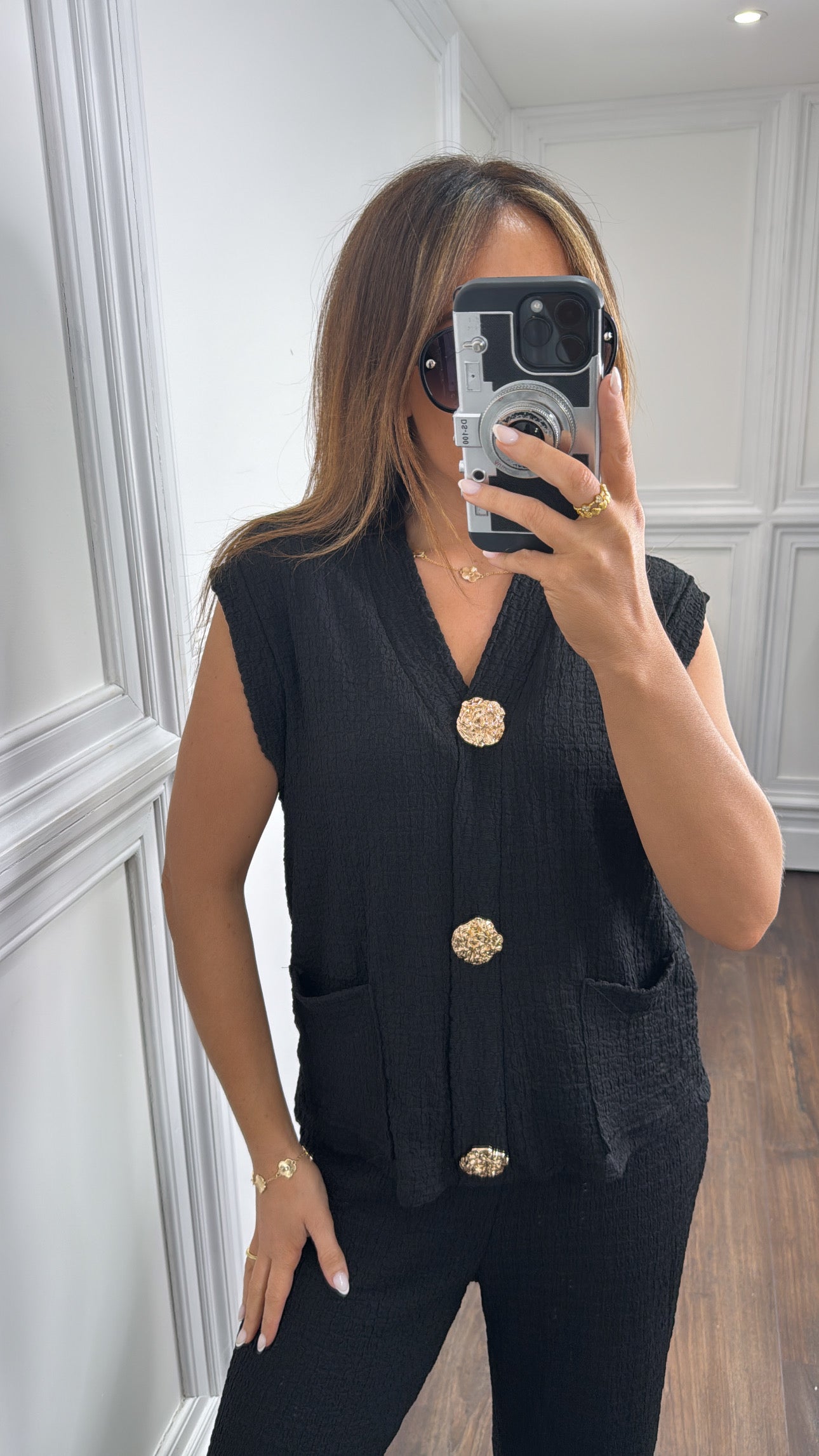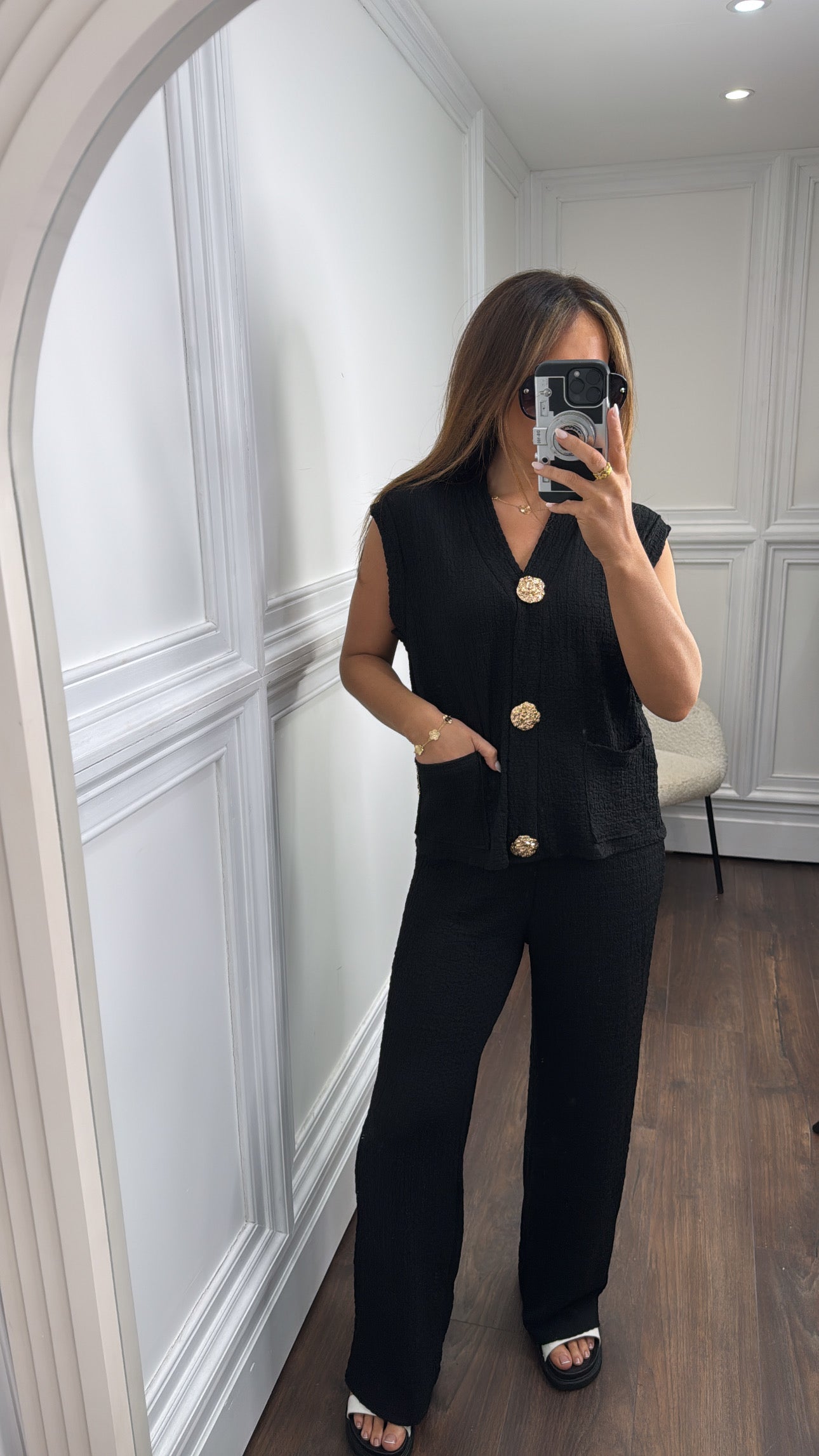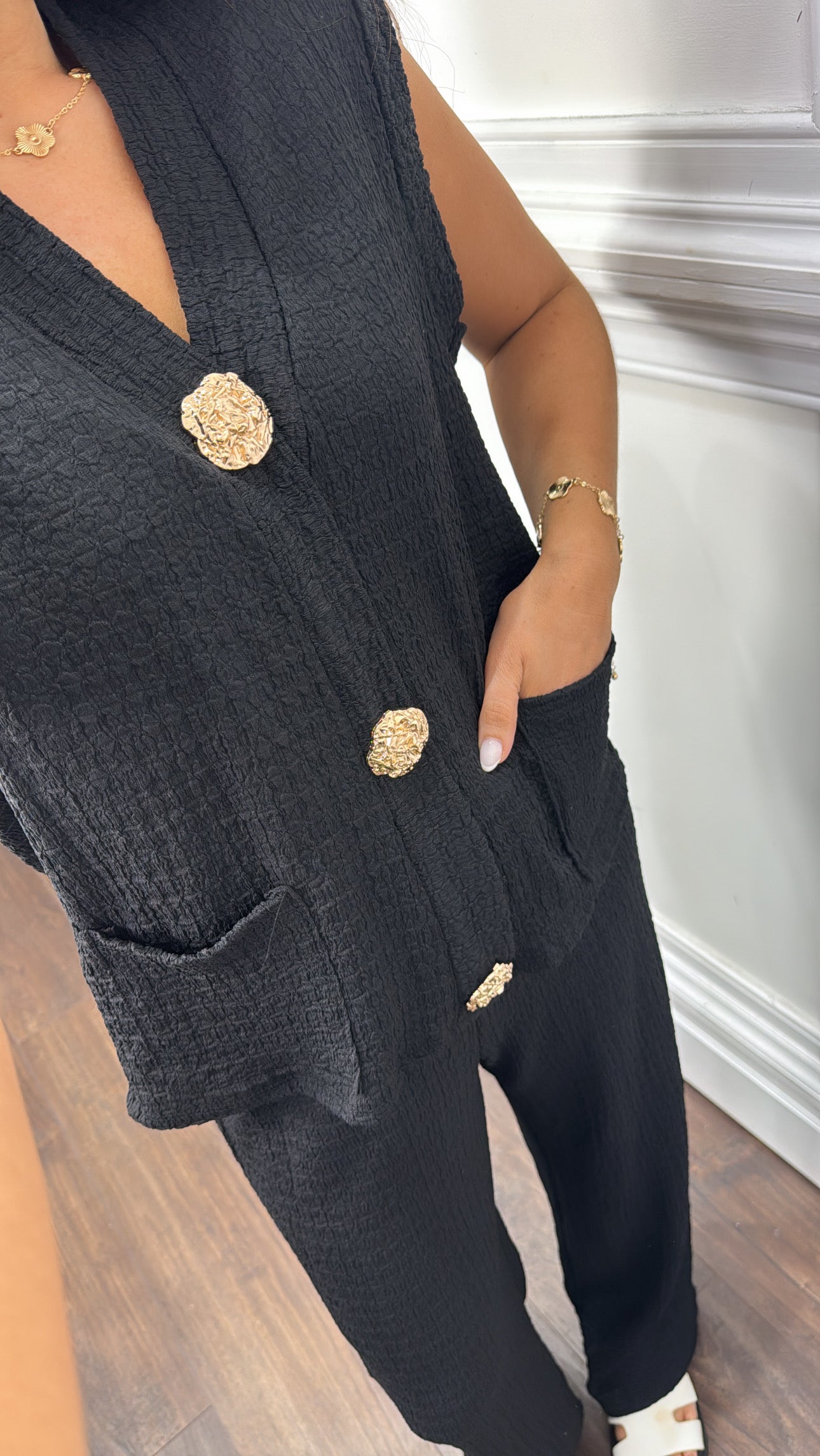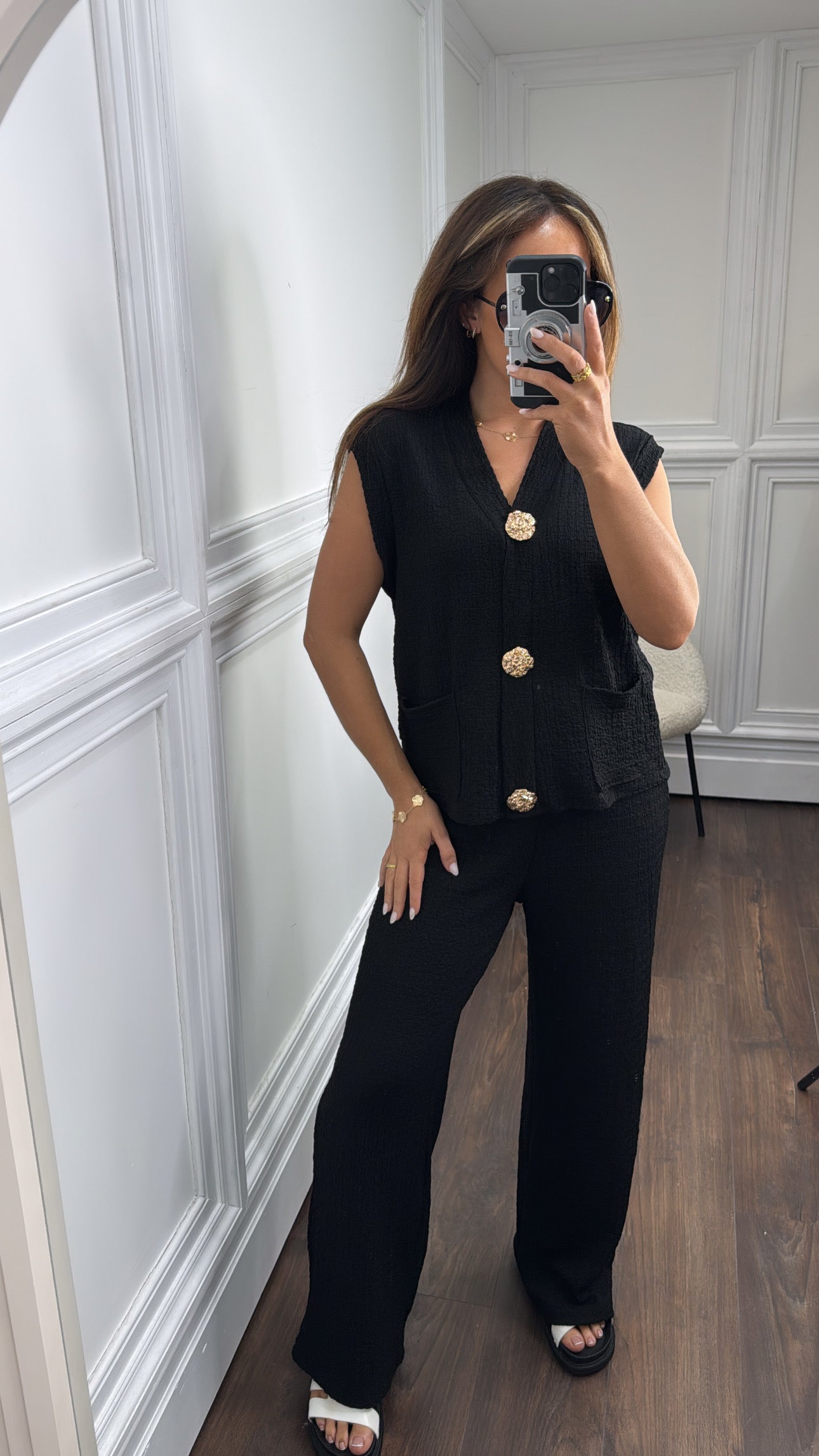 TAMSYN black gold button seersucker waist jacket and wide leg trouser co-ord