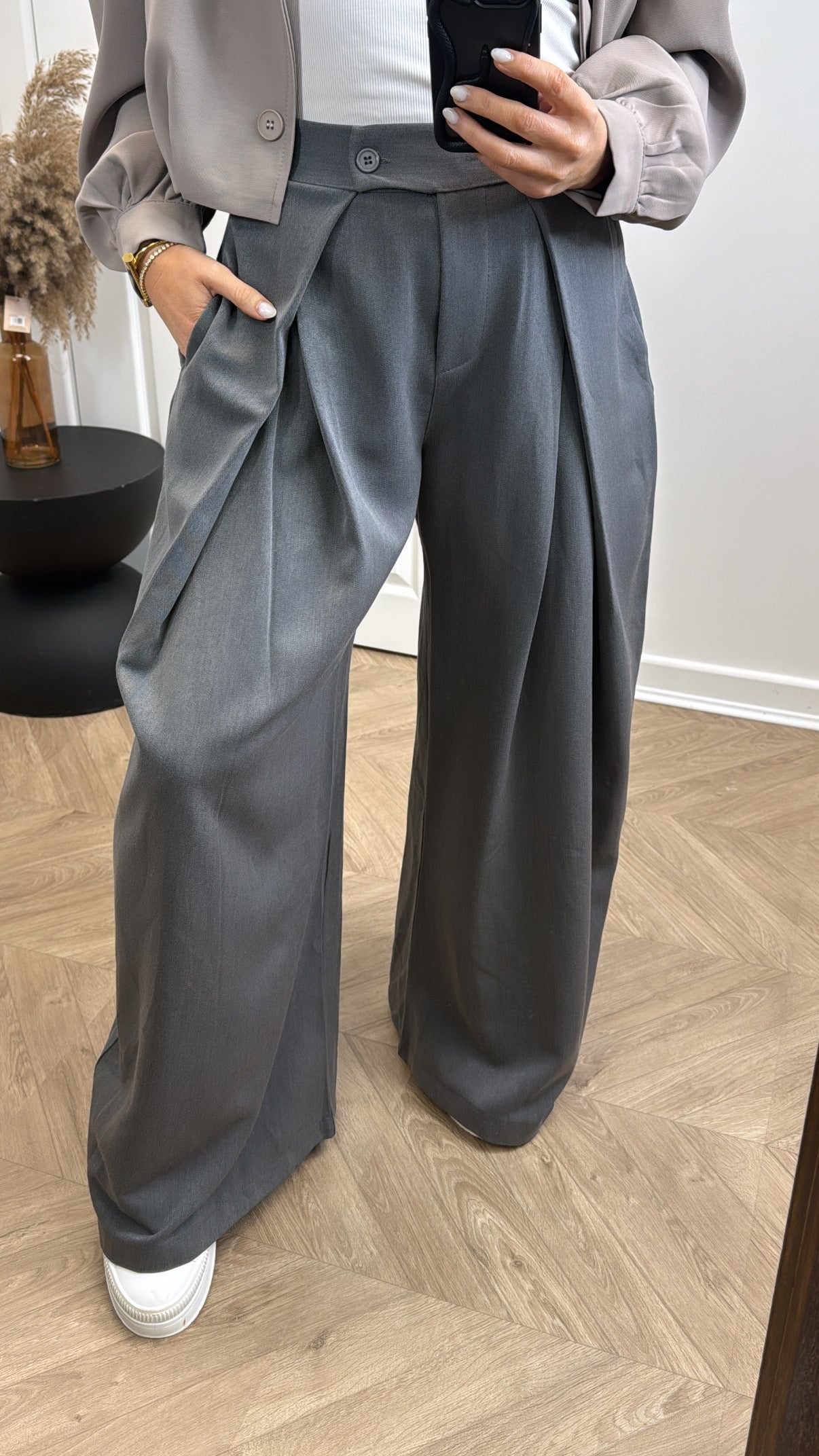 Elevate your everyday wardrobe with these TANYA grey flowing trousers. Designed for effortless sophistication, they feature a flattering wide-leg silhouette that moves beautifully with you. The front zip and button-up closure offer practical styling, while subtle pleated detailing adds refined texture. A stretchy waistband ensures all-day comfort without compromising on elegance. Perfect for transitioning from office to evening, these versatile trousers are a timeless investment piece.