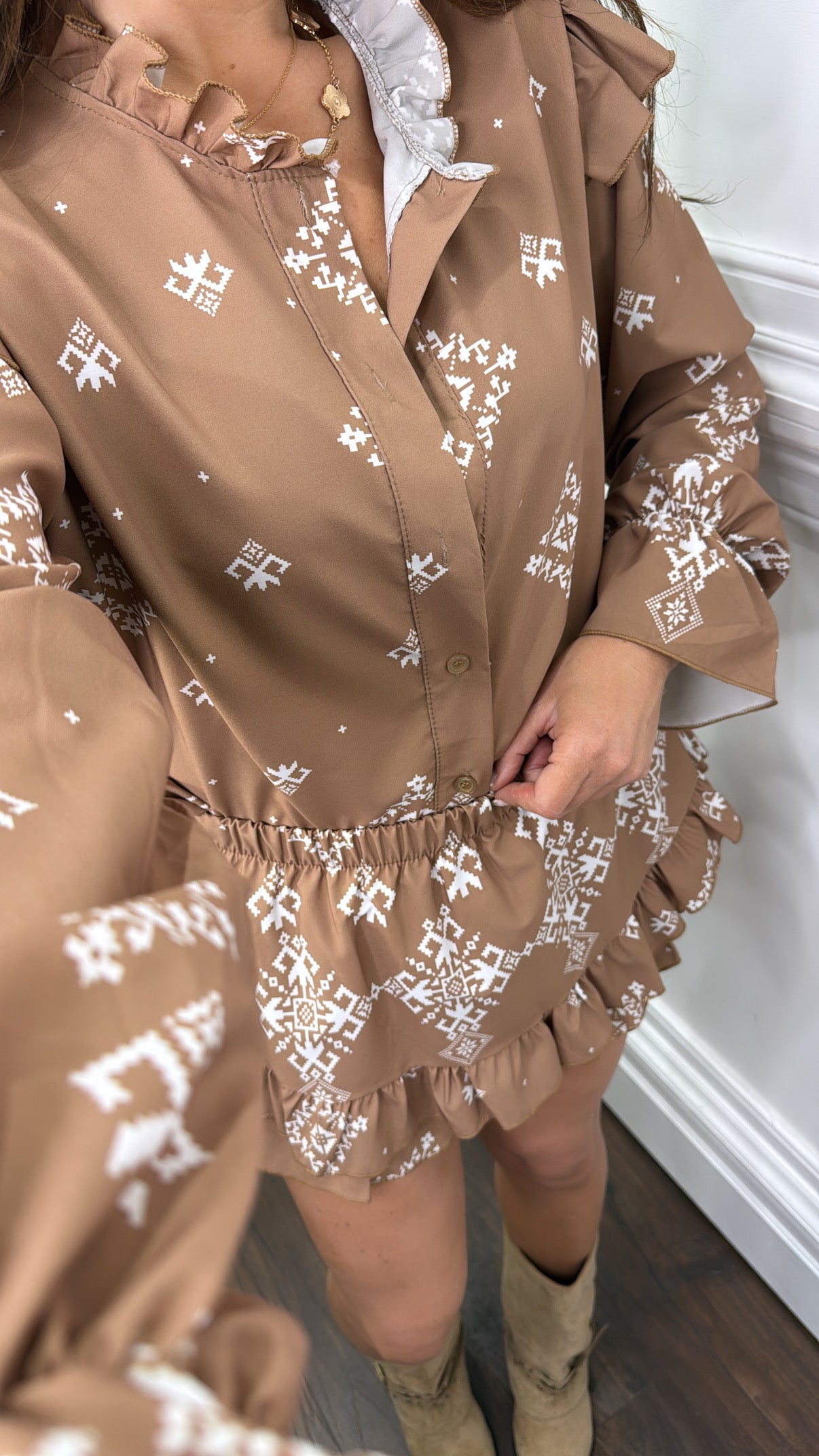 Our TEXAS camel ikat print ruffle skort co-ord features a stretchy waistband for all-day comfort and a playful ruffle detail that adds feminine flair. Perfectly styled with cowboy boots, it brings a chic, western-inspired edge to your wardrobe. Ideal for effortless, fashion-forward looks.