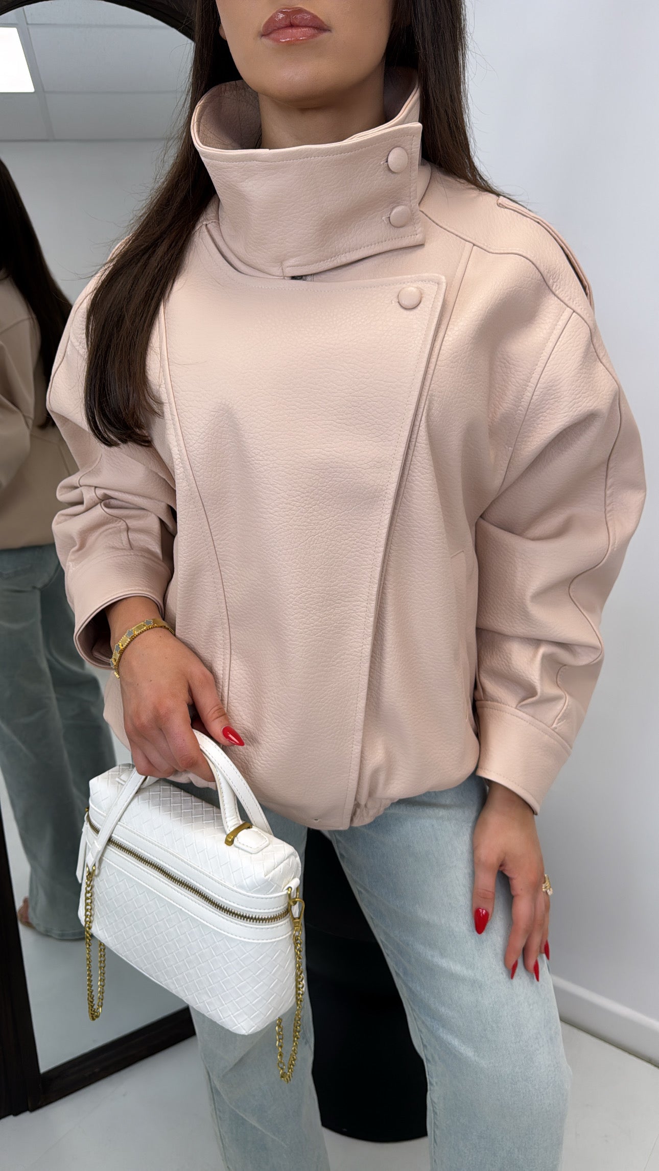 ZARIAH blush pink high neck oversize faux leather jacket